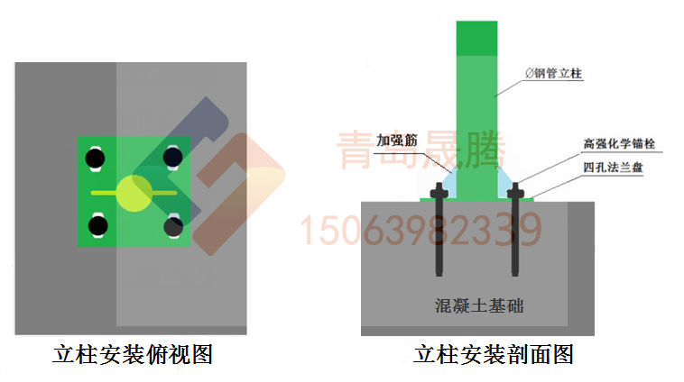 3.3組裝好一部分框架就一起扶起,第一個安裝立柱到定點(diǎn)位置后采用化學(xué)錨栓將法蘭盤固定孔位固定住,注意化學(xué)錨栓的螺帽不要擰死,然后依次順序固定;